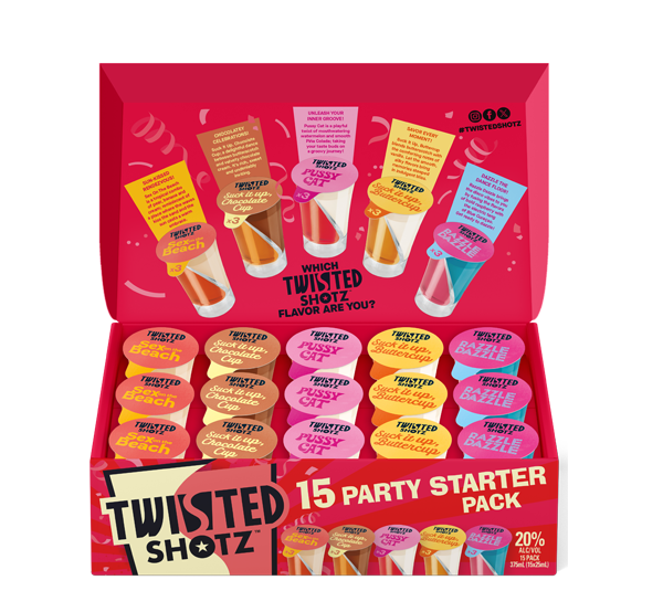 The Twisted Shotz Party Starter Pack features five fun, flavorful, dual-chamber shots designed for sharing and celebrating. Each 25 mL, 20% ABV shot delivers a unique dual-chamber flavor twist — from fruity to creamy to dessert-inspired. Perfect for parties, gifting, and gatherings.